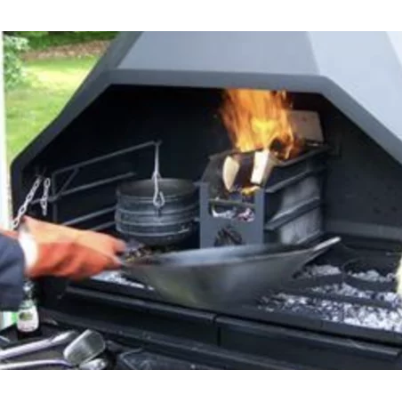 Vous aurez aussi la possibilité de varier les plaisirs en suspendant une marmite à la potence prévue à cet effet (incluse avec le barbecue) ou en utilisant un wok (option). Le compartiment avec porte situé sous le foyer principal pourra faire office de four!