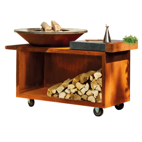 ConstituĂ© d’acier corten , il comprend un brasero OFYR black 100 pro (place de 100cm de diamètre) ainsi qu’un grand compartiment pour stocker le bois. Le OFYR Island black pro est une vĂ©ritable cuisine extĂ©rieure qui vous offre un large plan de travail en cĂ©ramique pour y poser votre planche Ă dĂ©couper ou vos plats.